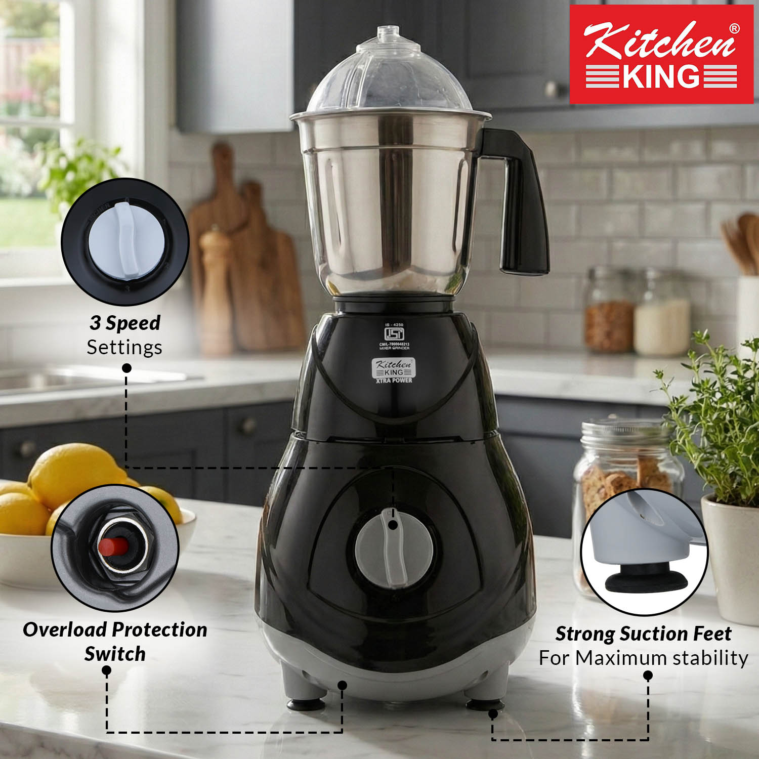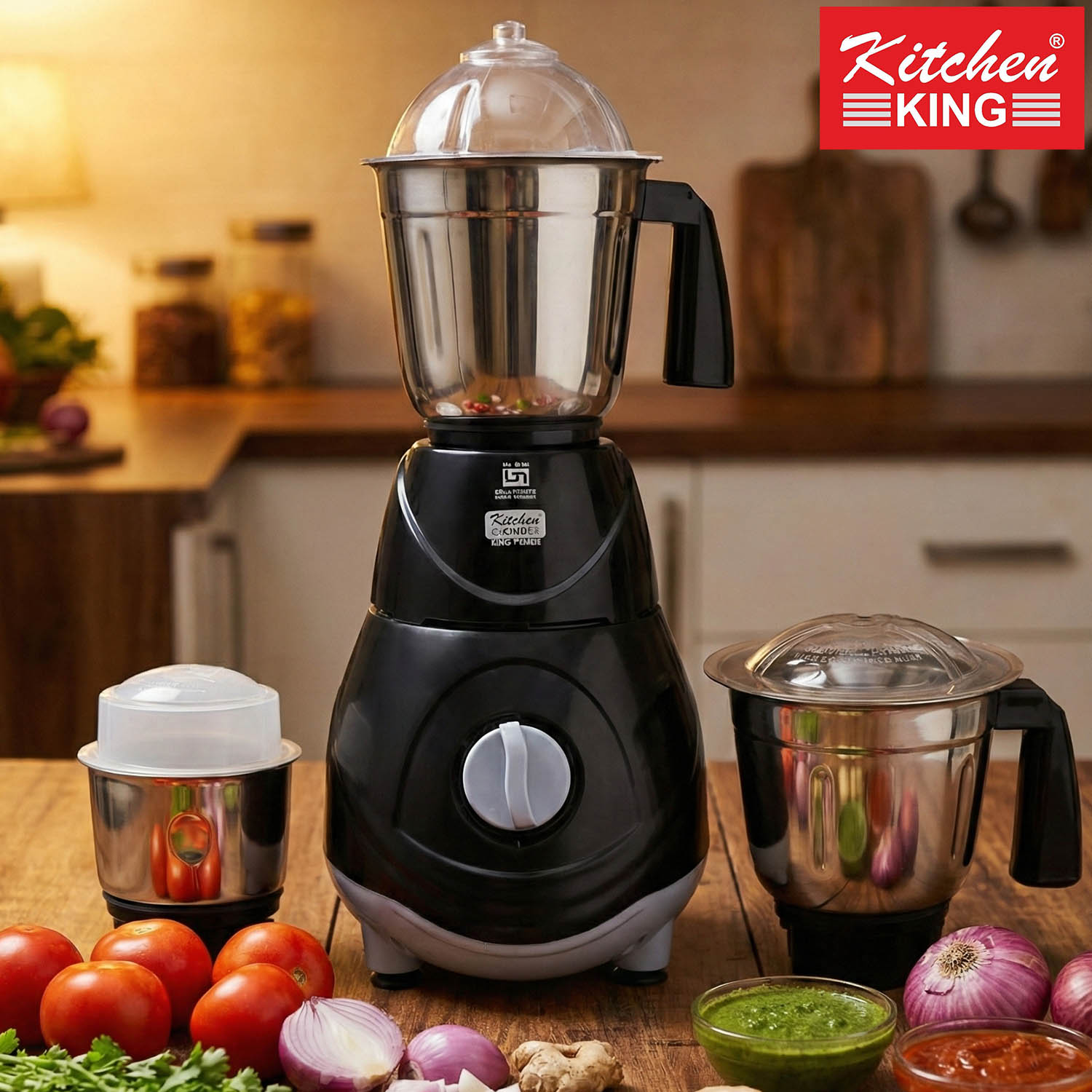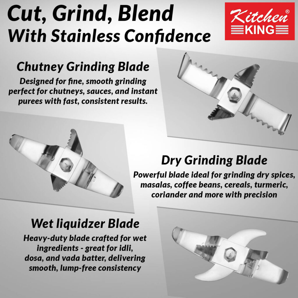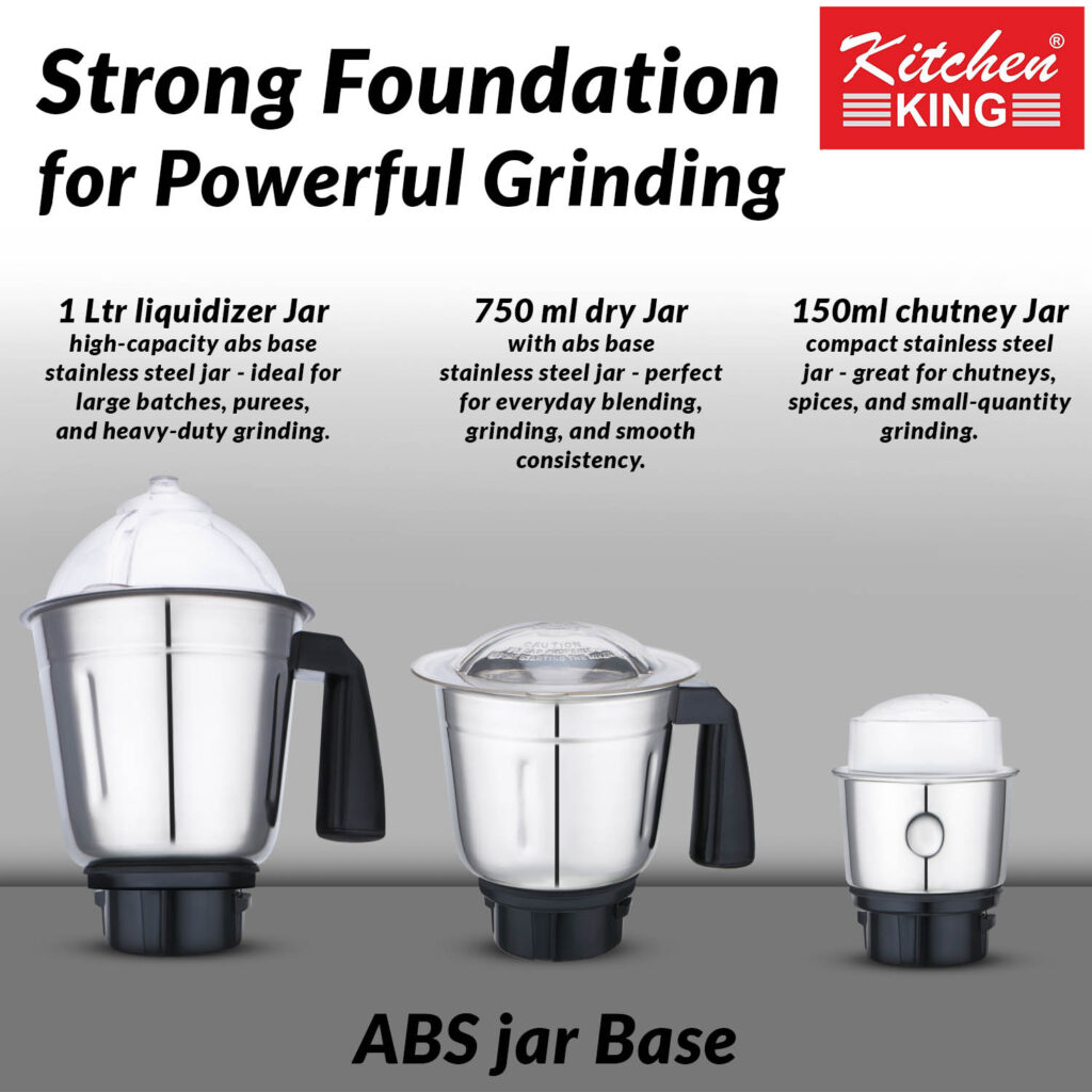 - Kitchen King Candy mixer grinder machine comes with 3 stainless steel jars with a capacity of 1L, 0.75L and 150 ml. The 1L jar can be used for wet grinding like preparing batters, the 0.75L jar can be used for grinding spices while the 500 ml jar can be used to make chutneys.