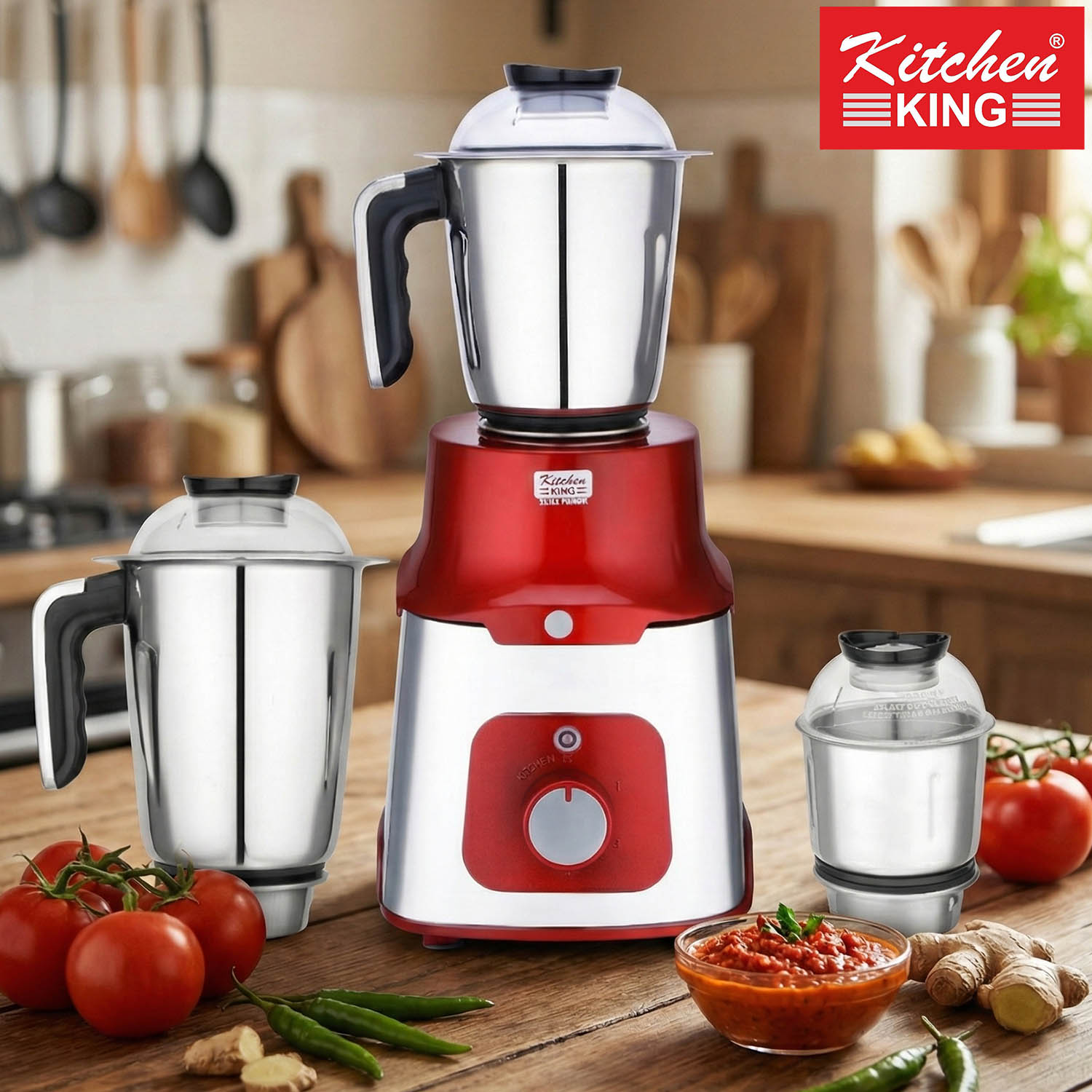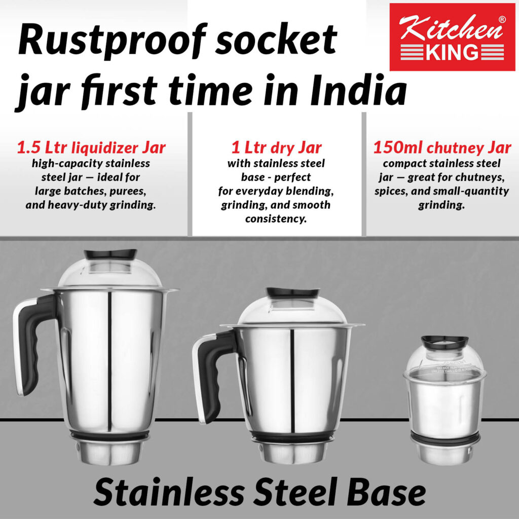 - Kitchen King Steelo mixer grinder Jars comes with 3 stainless steel jars with a capacity of 1.5L, 1L and 150 ml. The 1.5L jar can be used for wet grinding like preparing batters, the 1L jar can be used for grinding spices while the 150 ml jar can be used to make chutneys.