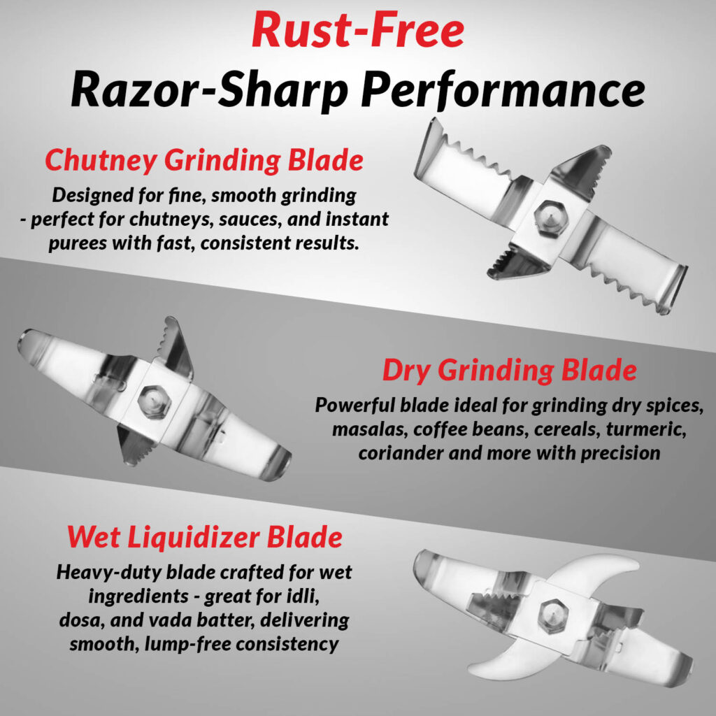 - Electrical Efficiency: Operating at 1 HP & a voltage of 230 volts, this mixer machine helps to grind spices, making chutneys and prepare batter with ease.