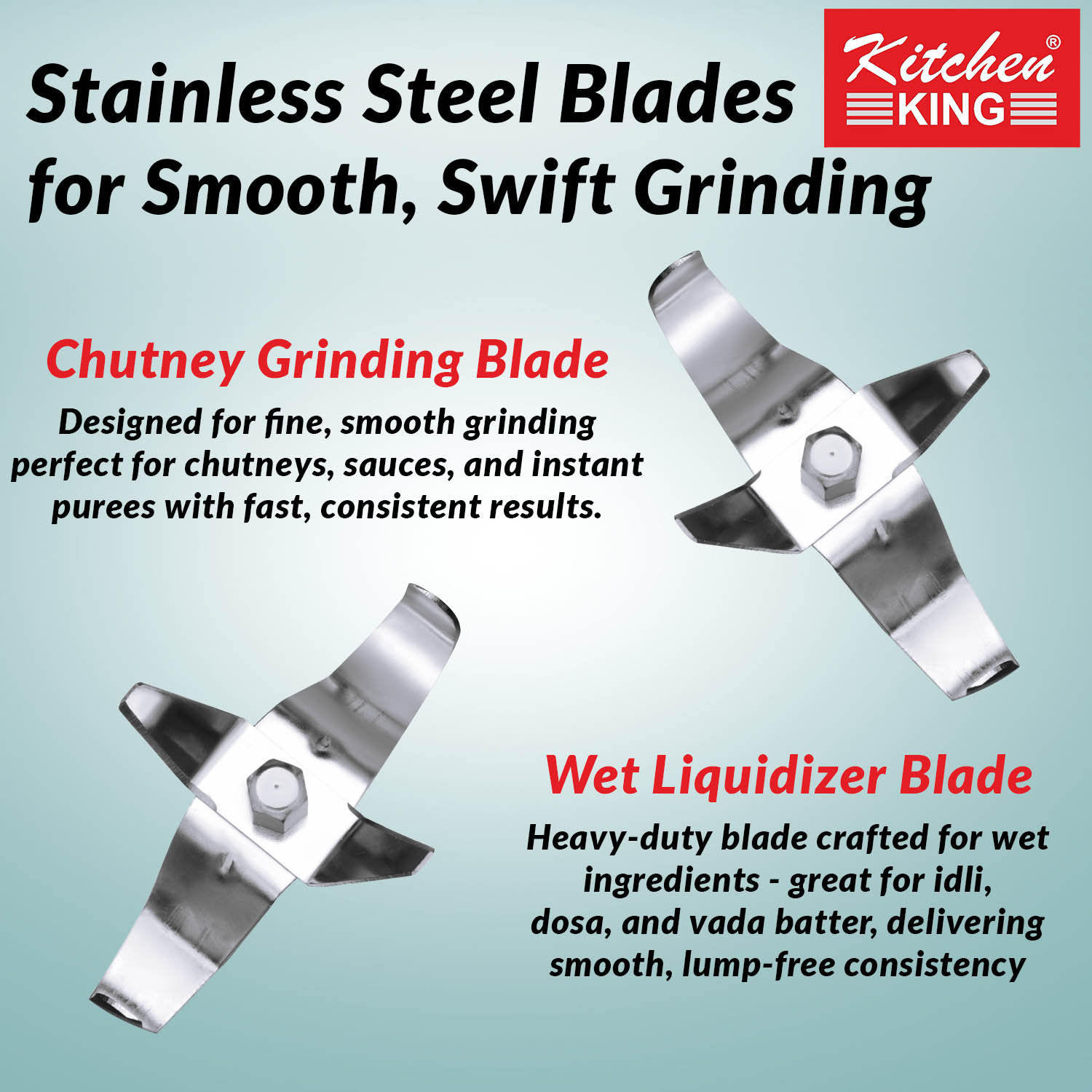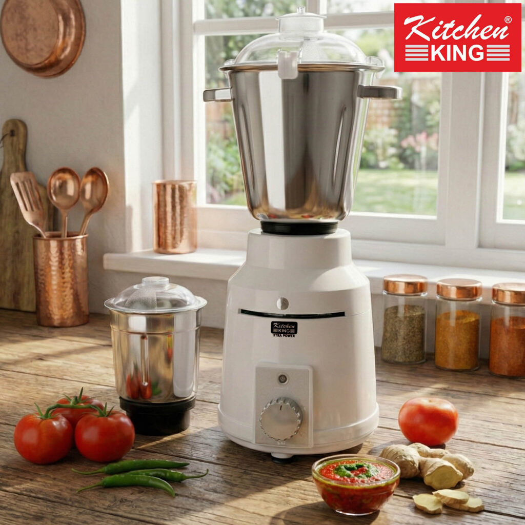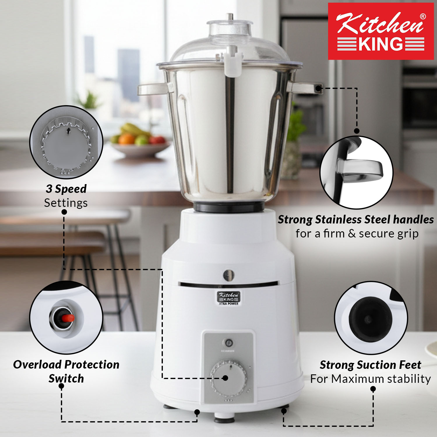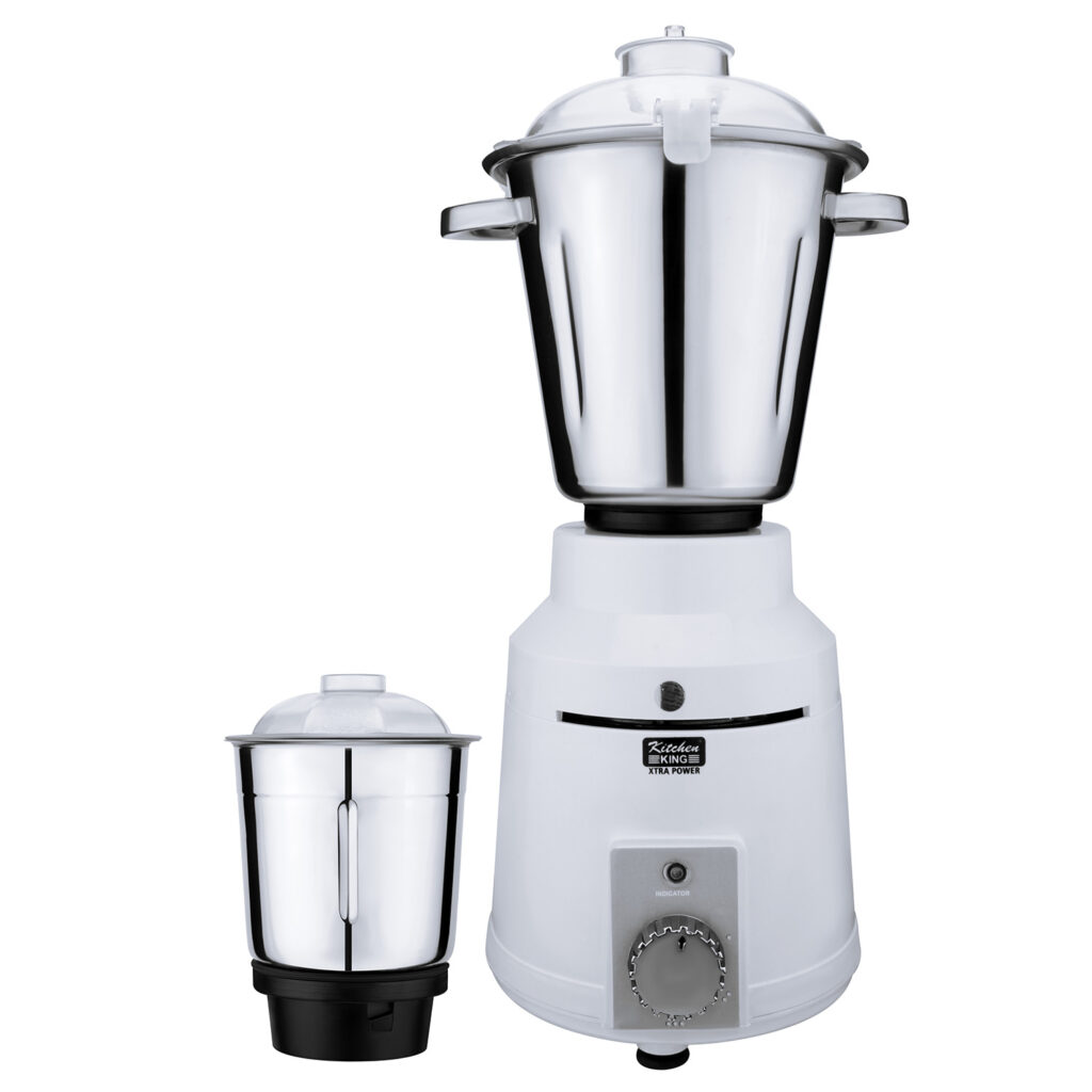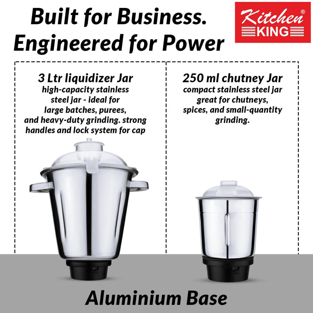 - Kitchen King Tempo Commercial Mixer Grinder with 2 stainless steel jars. The large blender jar has a capacity of 3 litres the other jar has 0.25 litre capacity.The liquidizer jars comes with heavy duty steel handles to handle all difficult work. It has universally hardened steel blades to grind anything and has commercial coupler between jar and motor.